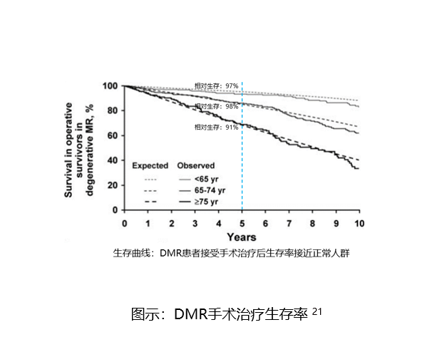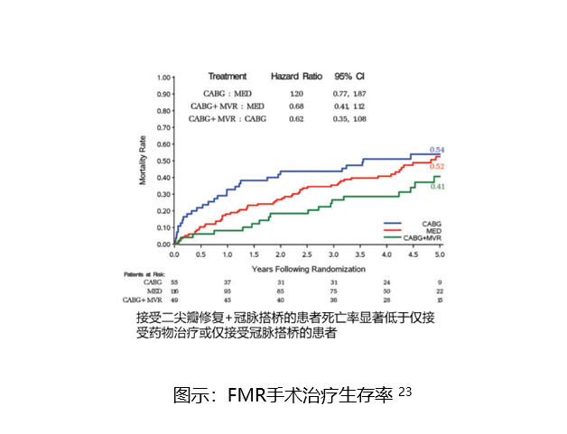 根據Cleveland Clinic報道12,FMR的外科治療手術治療率遠低于DMR(36.1 % vs 84.1%),因各種原因未能接受外科手術治療、僅接受藥物治療的重度二尖瓣返流患者,5年生存率僅為50%,甚至低于部分惡性腫瘤。